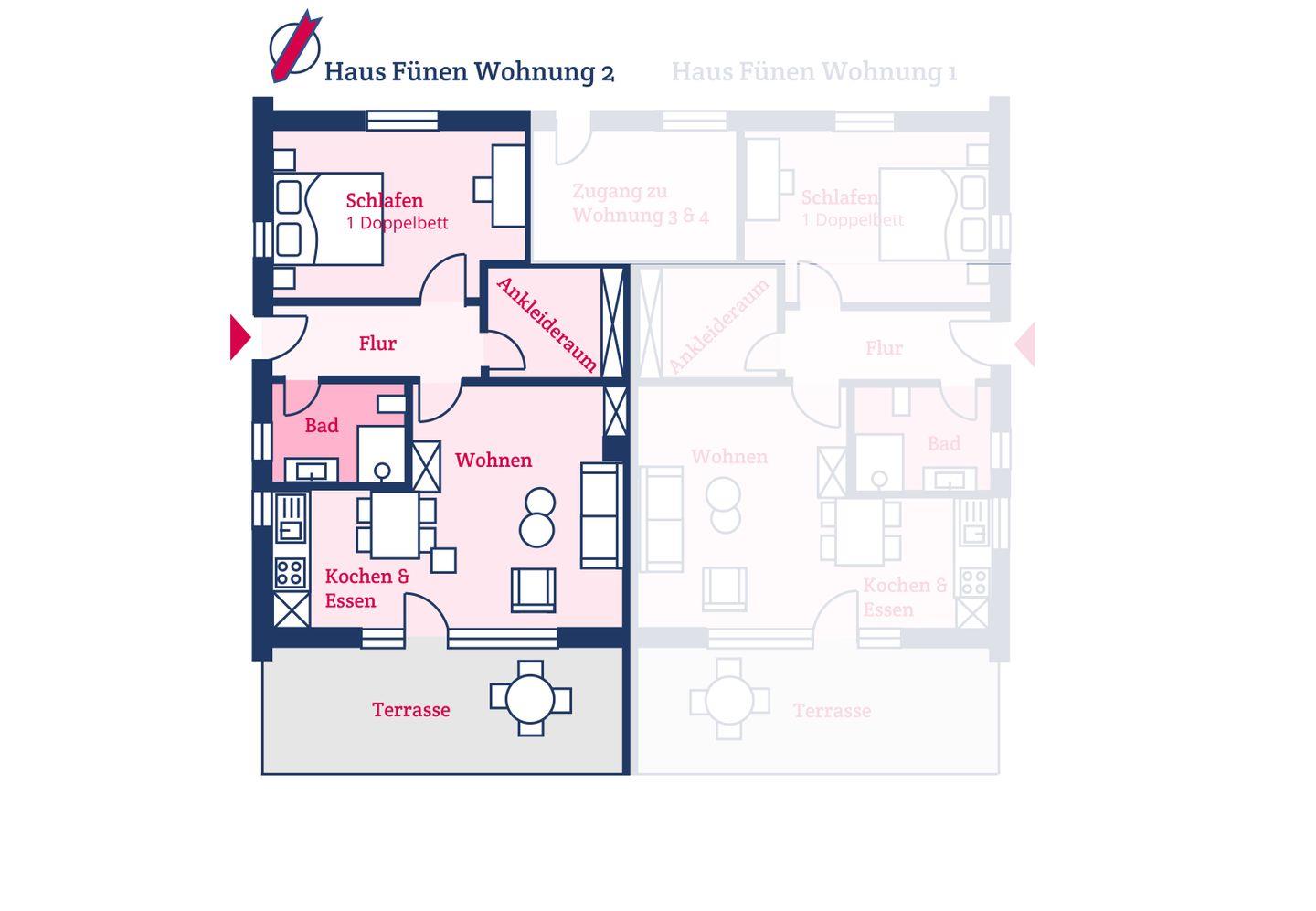 Die Ferienwohnung 2 im Haus Fünen am Südstrand verfügt über 1 Schlafzimmer und 1 Duschbad und bietet somit komfortabel Platz für bis zu 4 Personen zuzüglich einer Kleinkinderaufbettung.