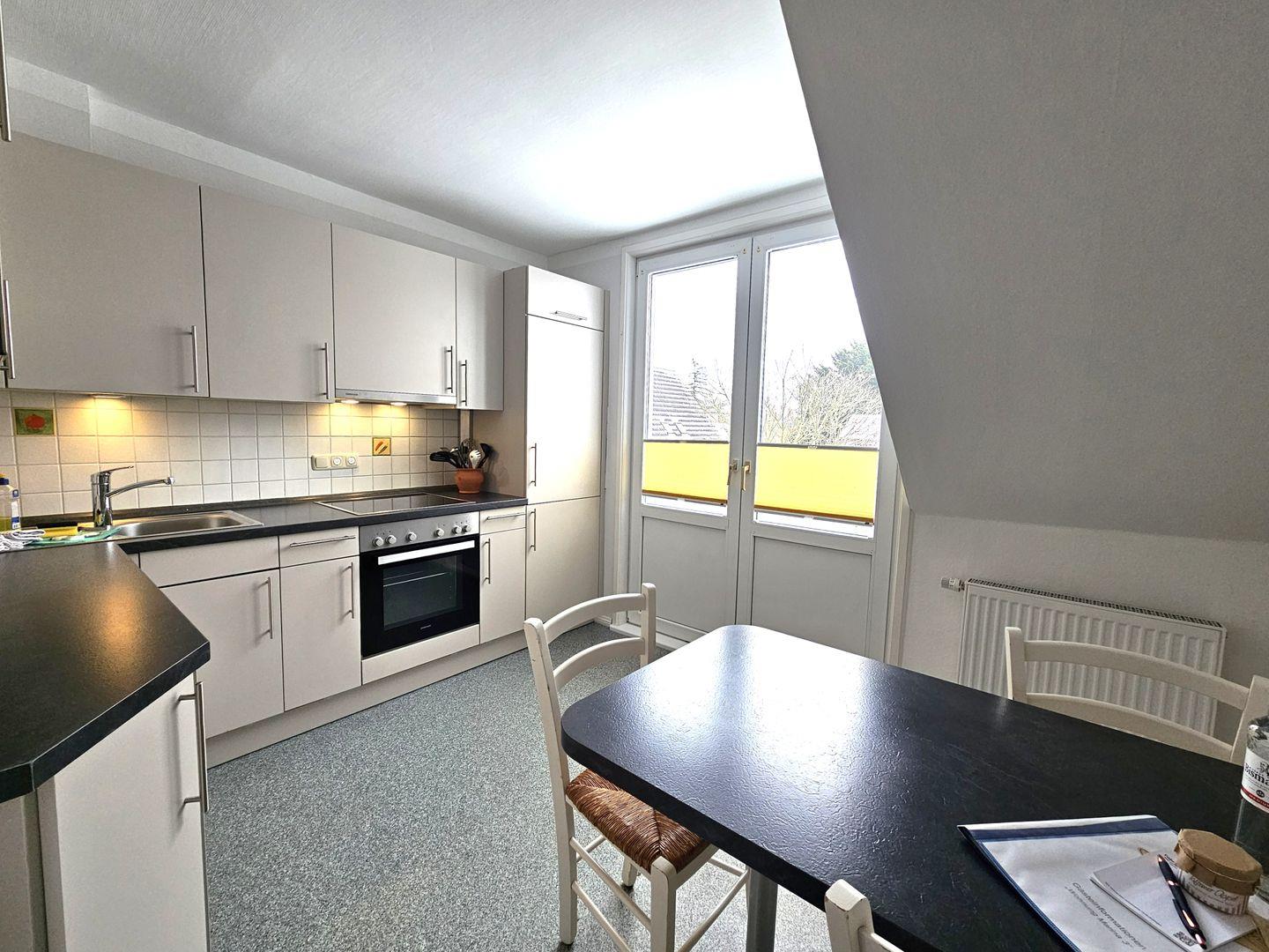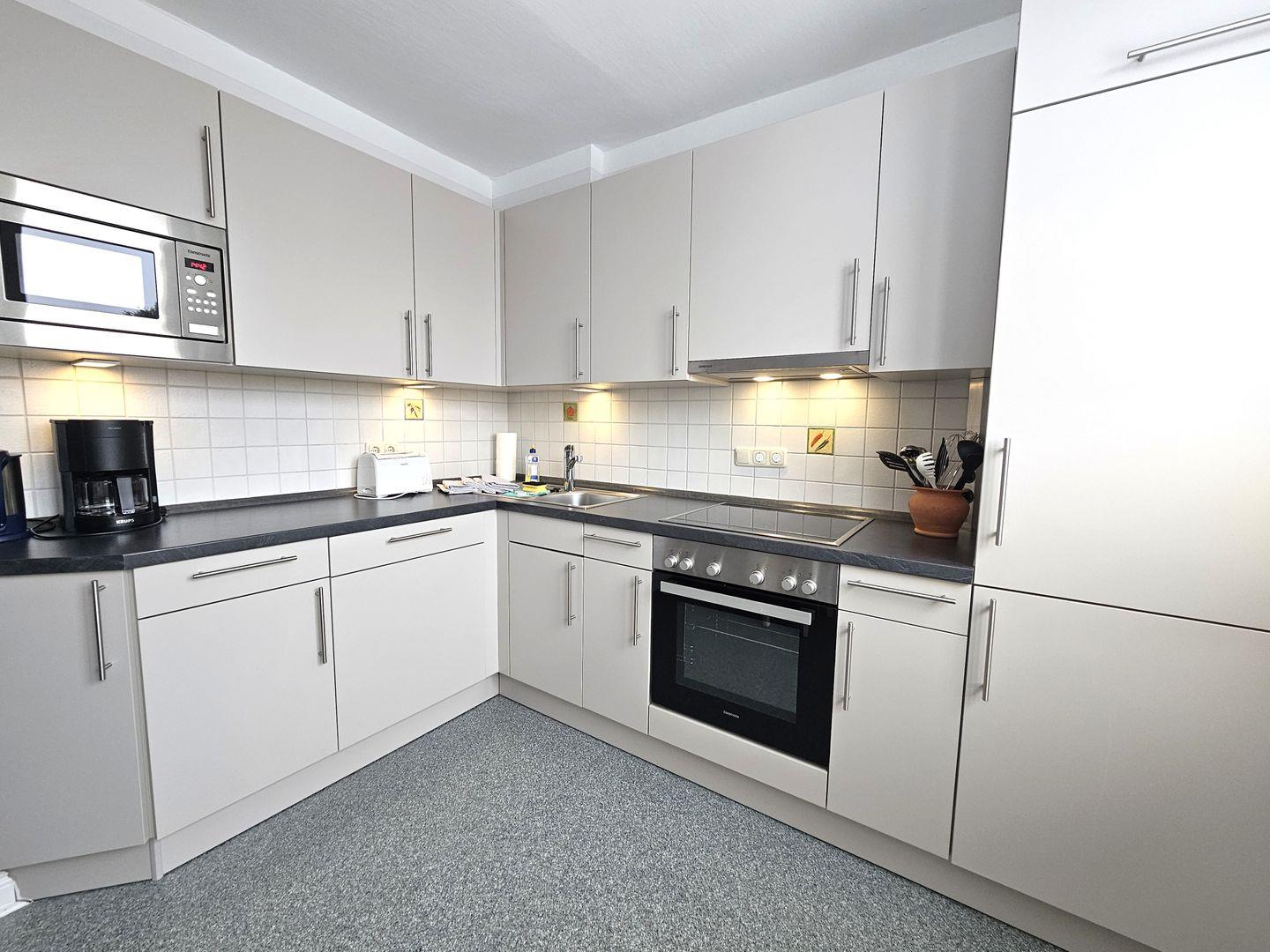 Die geschlossene Küche mit Esstisch und Essbereich ist vollständig auf den Urlaubsalltag ausgerichtet: vorhanden sind ein 4-Platten-Herd, Backofen, Mikrowelle, Spülmaschine, Kühlschrank mit Gefrierfach (Fach im Kühlschrank), Kaffeemaschine und Wasserkocher sowie Geschirr, Besteck und Küchenutensilien. Damit sind sowohl ein schnelles Frühstück als auch das gemeinsame Abendessen unkompliziert möglich.