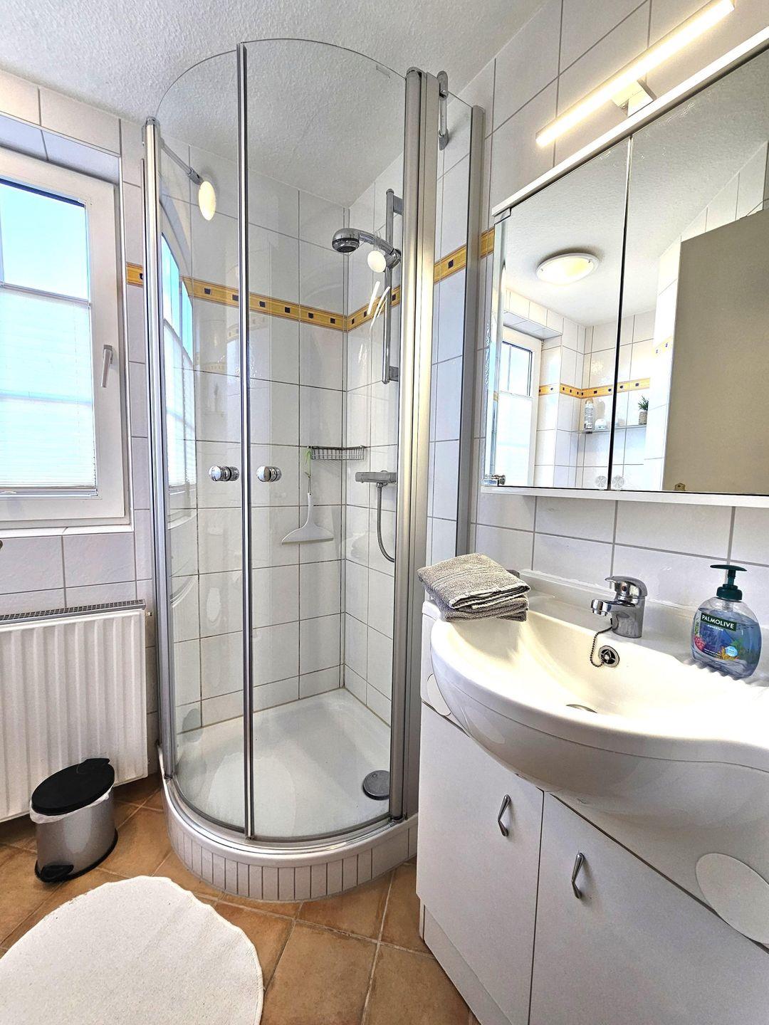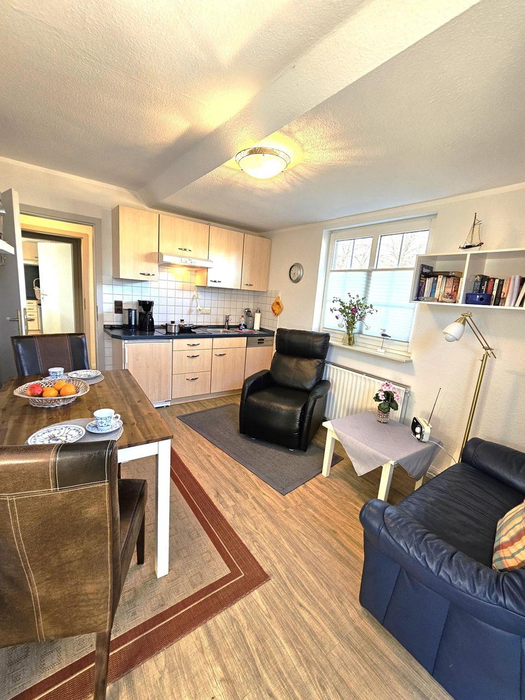 Die Ferienwohnung Möwe (30 m²) im 1. Stock bietet mit 1 Wohnzimmer mit offener Küchenzeile, 1 Bad und 1 Schlafzimmer ausreichend Platz für 2 Personen. Allergikerfreundlich und Nichtraucher, mit Balkon, WLAN und TV. Kochnische mit 4-Platten-Herd, Spülmaschine, Kühlschrank, Kaffeemaschine und Wasserkocher. 1 Parkplatz. Strand und Meer ca. 350 m, Stadt 850 m, Einkauf 950 m.