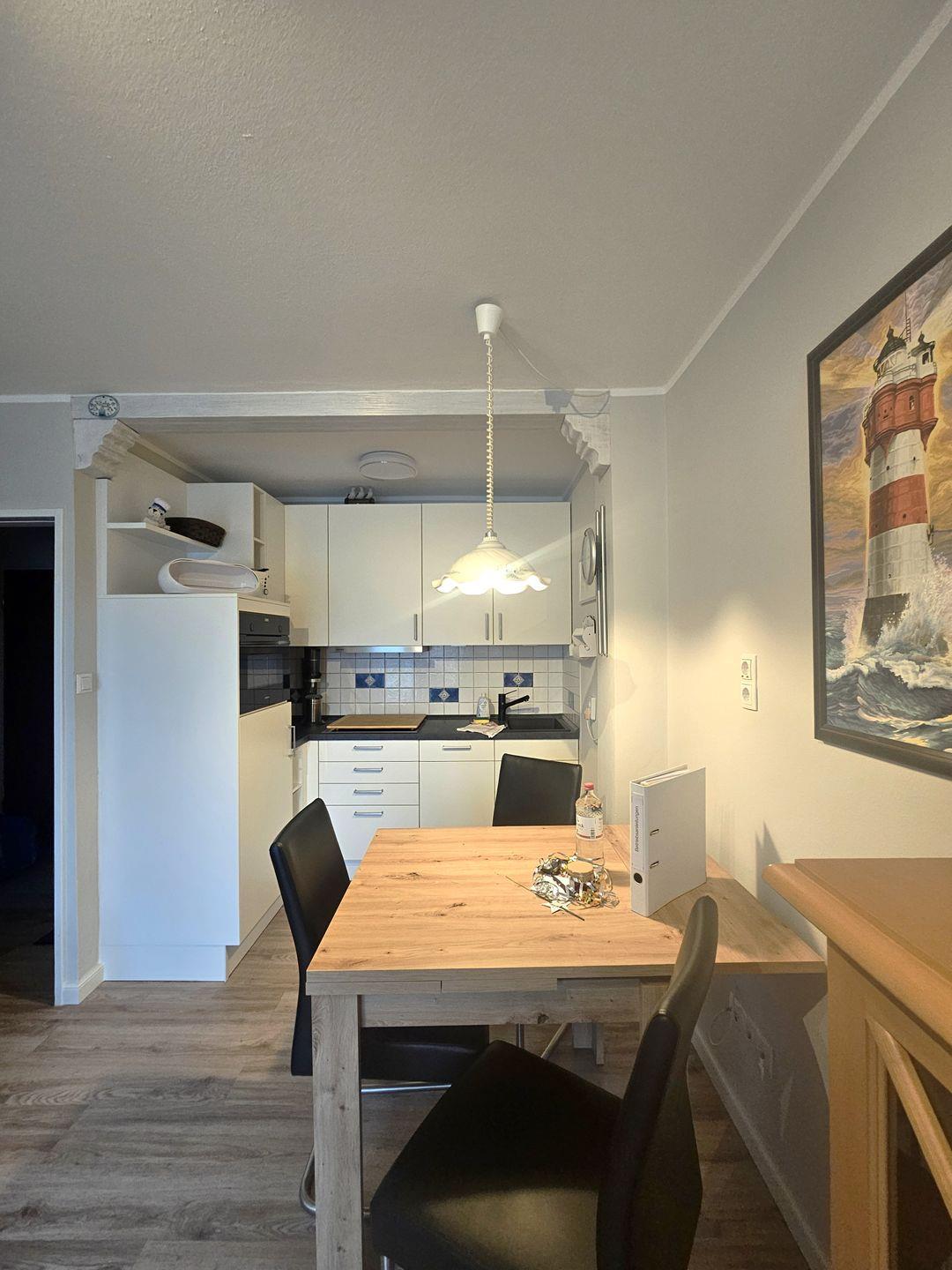 Die Küche ist offen zum Wohnzimmer gestaltet und für die Selbstversorgung vollständig ausgestattet: Herd, Mikrowelle, Kühlschrank mit Gefrierfach, Spülmaschine sowie Kaffeemaschine, Wasserkocher und Toaster. Geschirr, Besteck und Küchenutensilien sind vorhanden, sodass Sie direkt ankommen und Ihren Aufenthalt flexibel gestalten können.