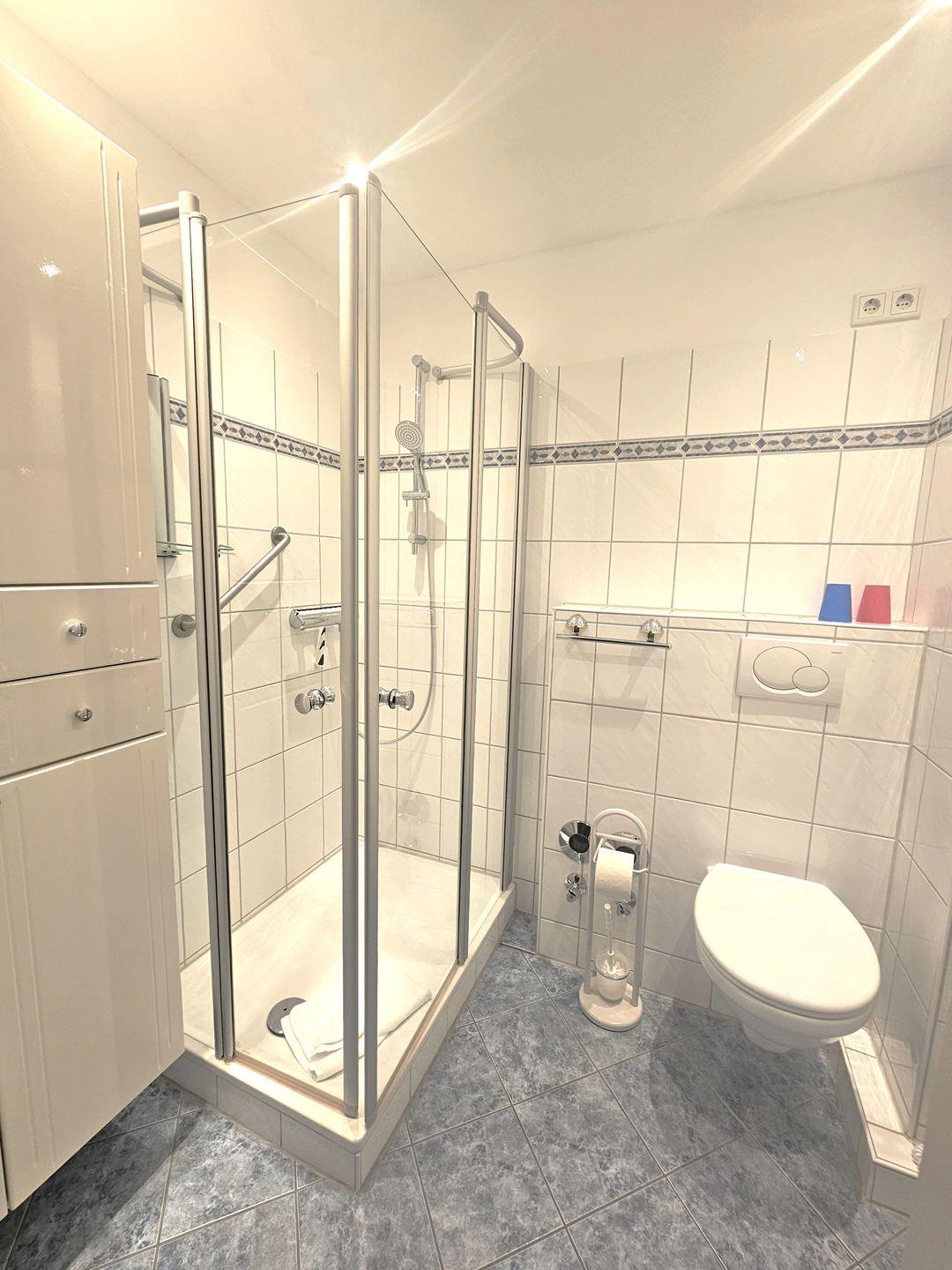 Das Badezimmer ist mit Dusche, WC und Waschbecken ausgestattet.