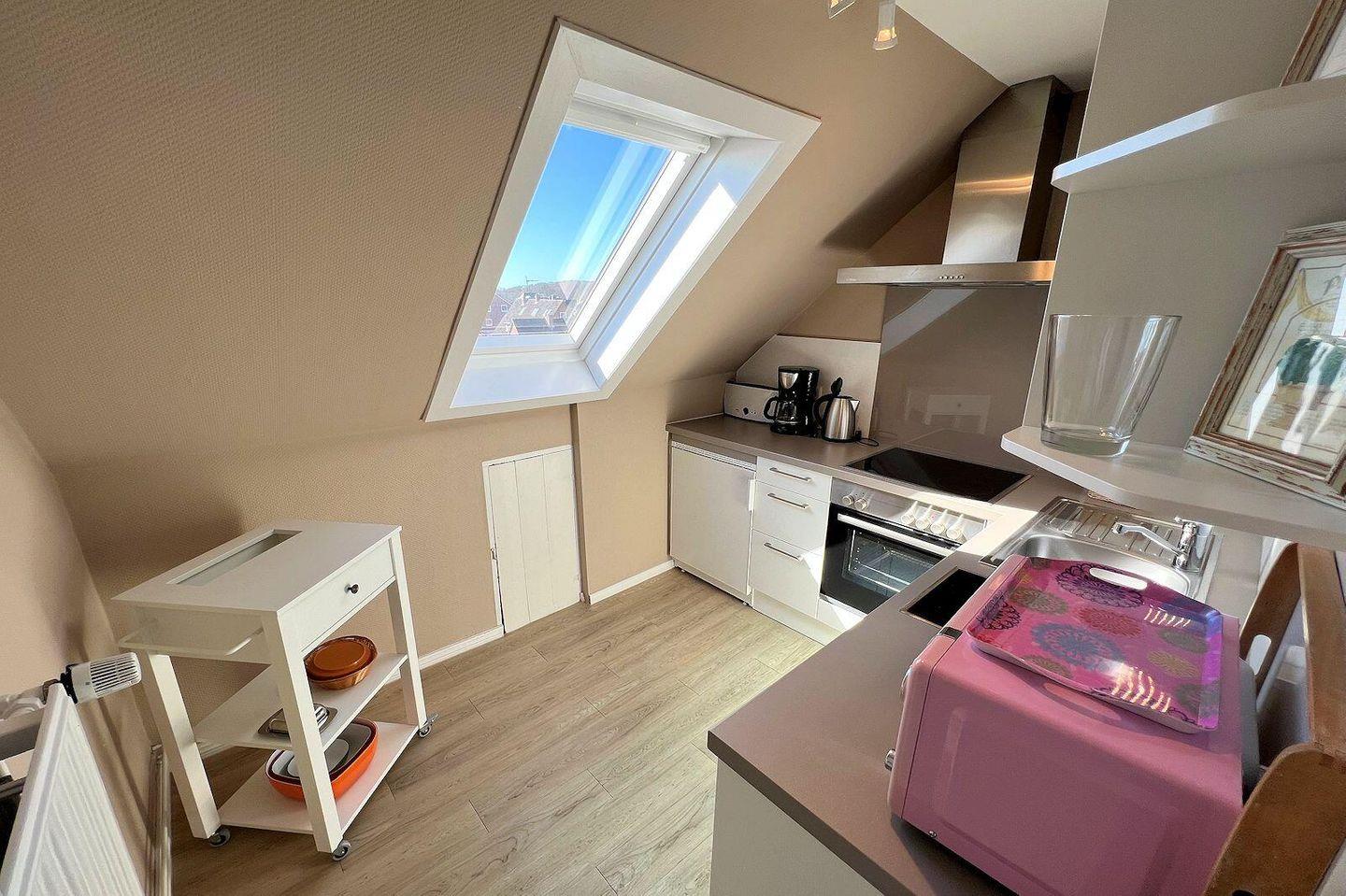 Promenadenblick – Wohnung 3 in Wyk auf Föhr: 34 m² im 3. Stock, 1 Wohnraum mit offener Küchenzeile, 1 Schlafzimmer und Bad mit Dusche. Helle Nichtraucherwohnung am Meer, nur 50 m zum Strand, mit Balkon und außergewöhnlich gutem Meerblick. Voll ausgestattete Küche inkl. 4-Platten-Herd, Backofen, Mikrowelle und Spülmaschine, WLAN, TV/Radio/CD. Haustiere erlaubt (max. 2)