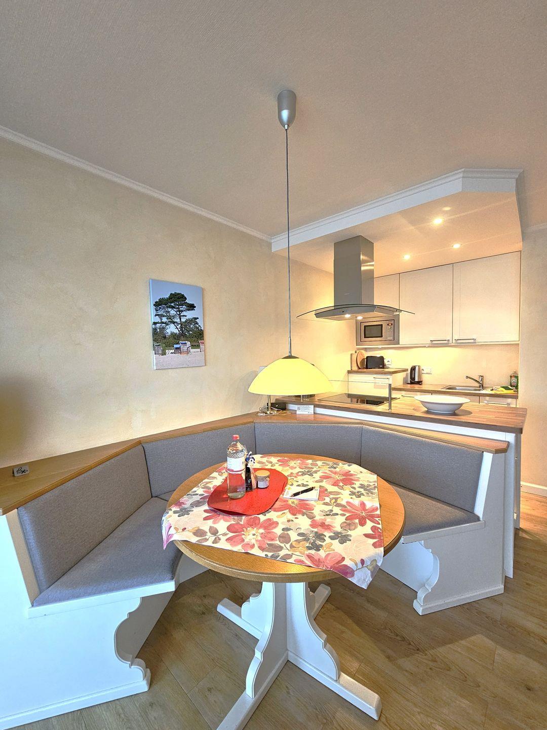 Die Küche ist offen zum Wohnzimmer gestaltet und mit Essbereich und Esstisch ideal, wenn Sie gemeinsam kochen und essen möchten. Zur Ausstattung gehören Herd mit 4-Platten-Kochfeld, Mikrowelle, Kühlschrank mit Gefrierfach (Fach im Kühlschrank), Spülmaschine, Wasserkocher, Kaffeemaschine, Toaster sowie Geschirr, Besteck und Küchenutensilien.