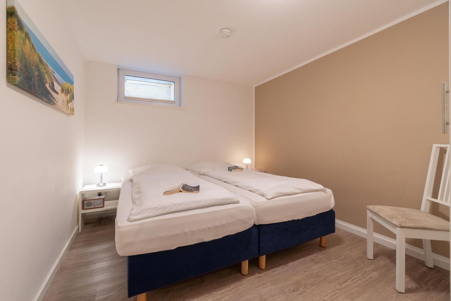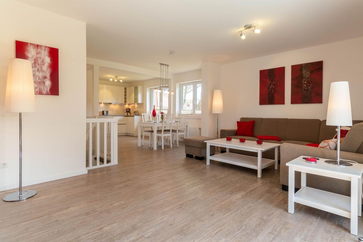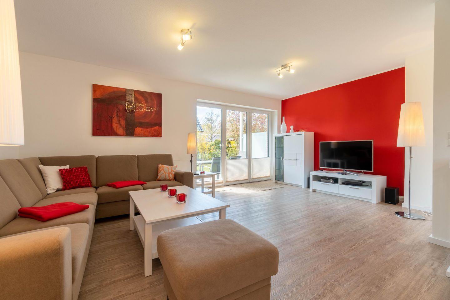 Die Ferienwohnung 1 überzeugt durch den großen, hellen, kombinierten Wohn-Essbereich mit der komplett ausgestatteten, integrierten Küche. Von hier aus haben Sie auch einen direkten Zugang auf die Terrasse und in den Garten. Die Wohnung verfügt über zwei Schlafzimmer im Souterrain sowie über zwei Duschbäder. Die moderne Ausstattung der Wohnung wird Sie überzeugen, ebenso wie der große Smart-TV im Wohnbereich. Ein Flachbildfernseher ist auch in einem der beiden Schlafzimmer vorhanden.