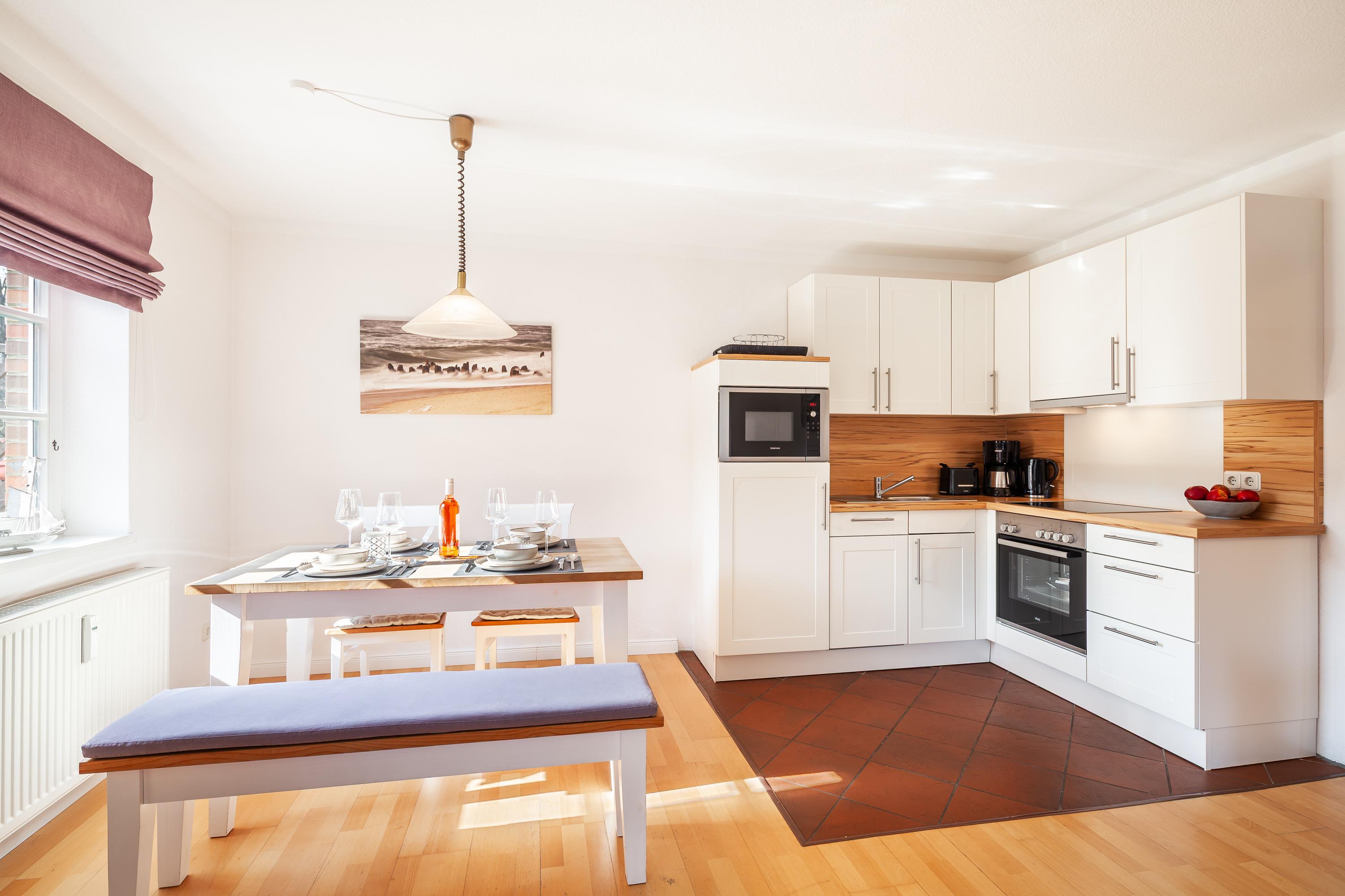 Die Erdgeschosswohnung Nr. 2 bietet Platz für zwei bis drei Personen. Ein großzügiges und helles Wohnzimmer mit bequemen Sofas, ein Essplatz sowie eine moderne Küchenecke lassen keine Wünsche offen. Vom Wohnzimmer aus geht es direkt auf die windgeschützte Südterrasse mit [nbsp]Mobiliar. Ein Schlafzimmer mit hochwertigem Boxspringbett, ein Ruheraum im Souterrain sowie ein Duschbad mit Fenster gehören ebenfalls zur Wohnung.