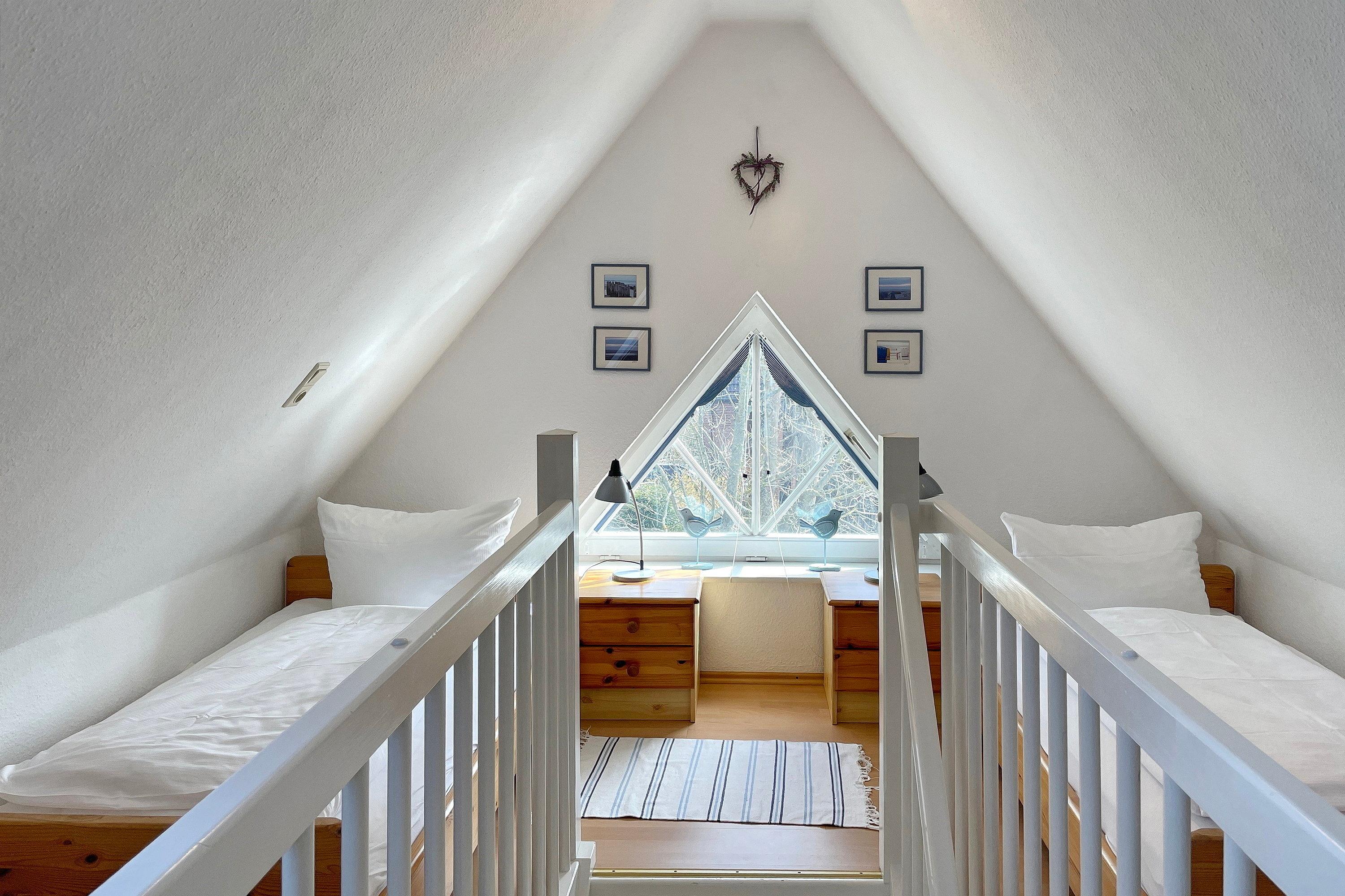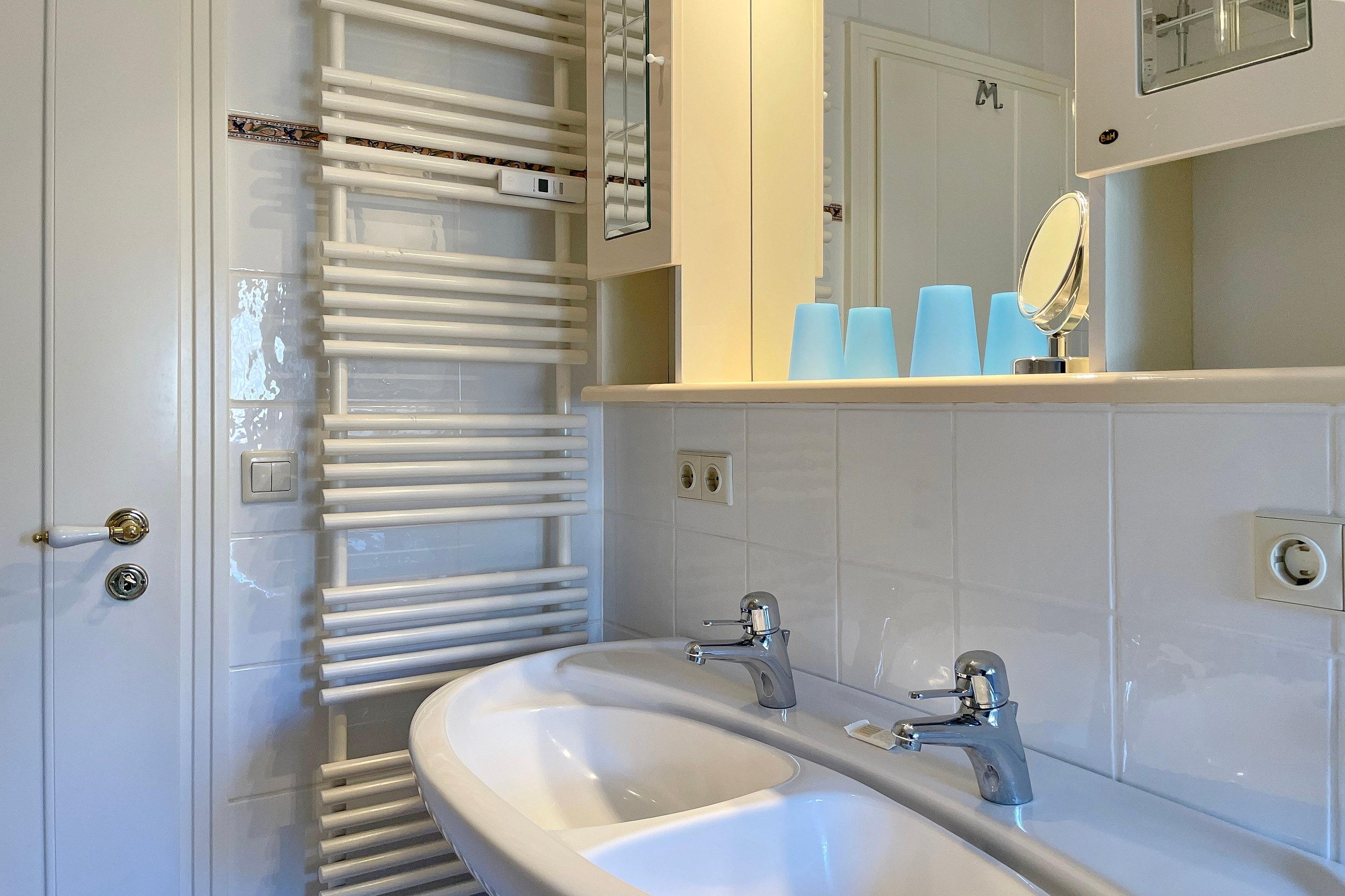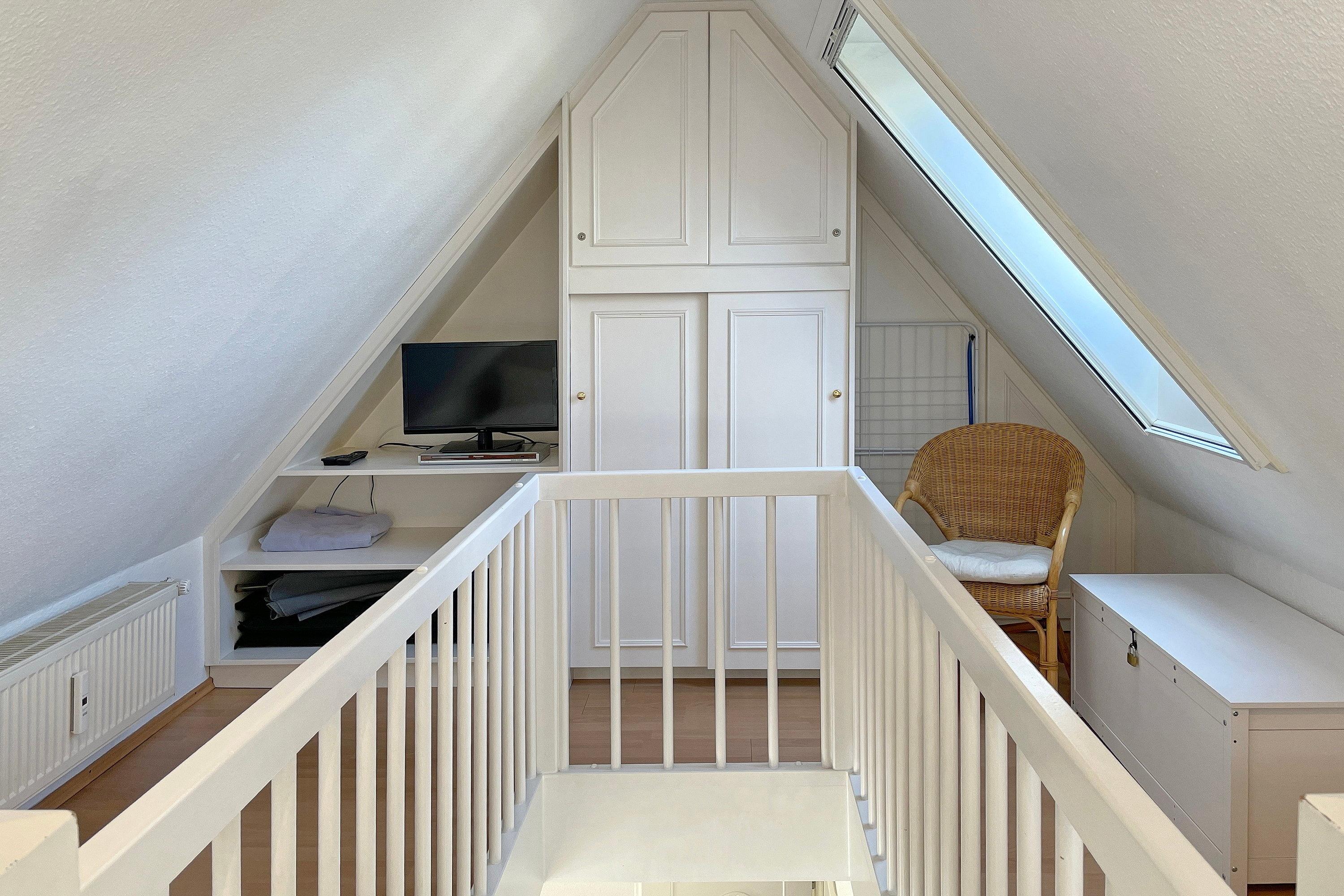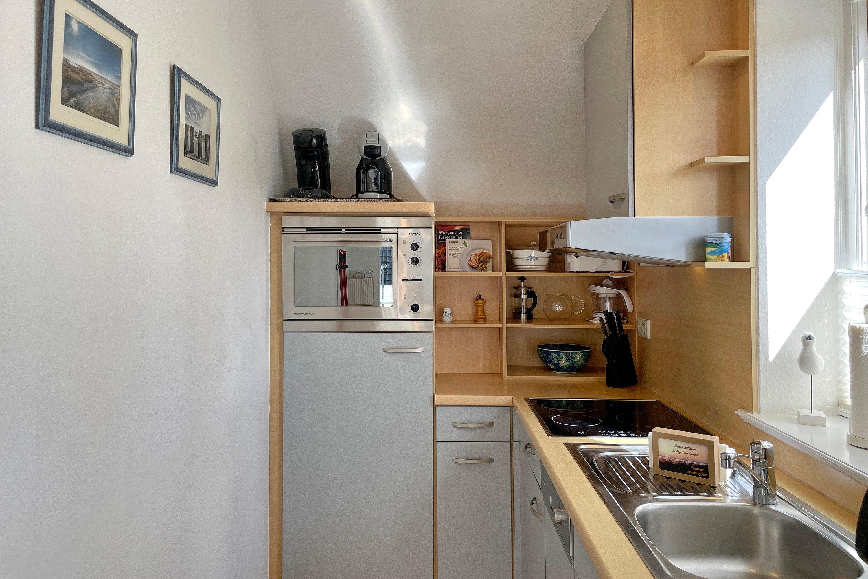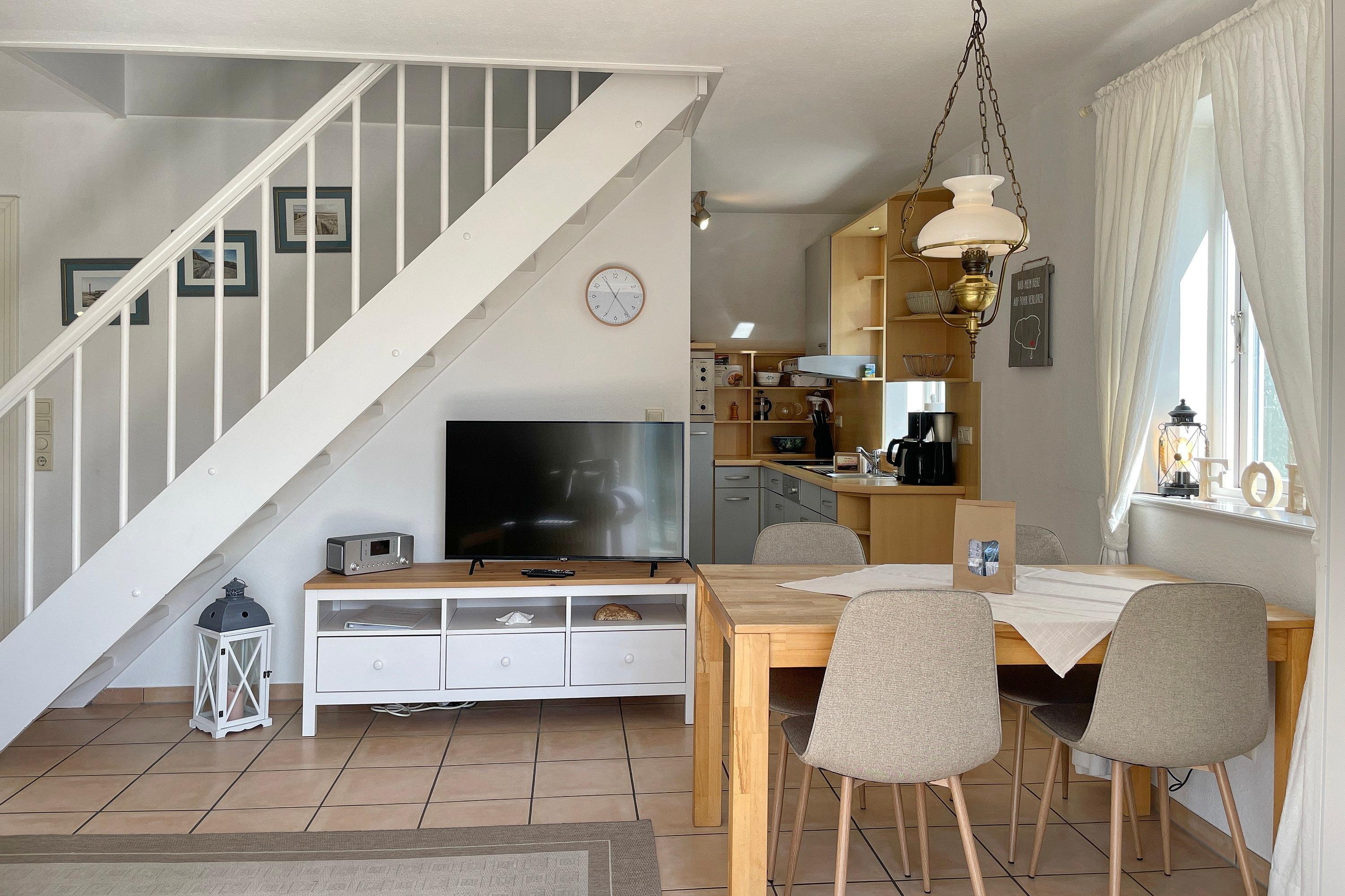 Unsere gemütliche Obergeschosswohnung Friesenperle 6 erstreckt sich über zwei Etagen und bietet 4 Gästen ausreichend Platz erholsame Urlaubstage zu verbringen. Das Bad ist mit Dusche mit flachem Einstieg und Handtuchheizkörper ist, verfügt über einen Doppelwaschtisch und ein Fenster. Der Schlafraum mit Doppelbett (160 x 200 cm) und Dachfenster mit Blick zu den Sternen lädt zum Träumen ein. Der Hauptwohnbereich mit integrierter Küche und Essplatz wirkt einladend und das Wohnzimmer mit zwei hübschen Sofagarnituren, WLAN, Flachbild-TV, DVD-Player, Haustelefon und Stereoanlage eignet sich hervorragend zum Entspannen. Von hier aus gelangen Sie auf den Südbalkon mit Gartenmöbeln (ca. April bis Oktober). Die Küchenzeile mit Ceranfeldherd und Backofen, Geschirrspüler, Kühlschrank mit Gefrierfach, Kaffeemaschine und einer zusätzlichen Senseo Maschine ist vollausgestattet. Im 2. Obergeschoss finden Sie einen weiteren offenen Schlafbereich vor mit zwei Einzelbetten (90 x 200 cm) und einem zweiten Fernseher. Ihr Hund ist hier ebenfalls herzlich Willkommen. Genießen Sie herrliche Urlaubstage in einer Wohnung, die keine Wünsche offen lässt.
