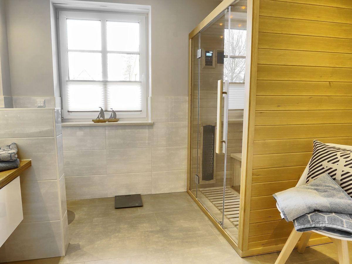 Das hochwertige Badezimmer , mit einer Infrarotkabine , verfügt über eine ebenerdige Dusche mit Regenshower und einer Handbrause, WC, edlem Waschtisch, beheizbaren Handtuchtrockner, Kosmetik-Vergrößerungsspiegel und einem Föhn.