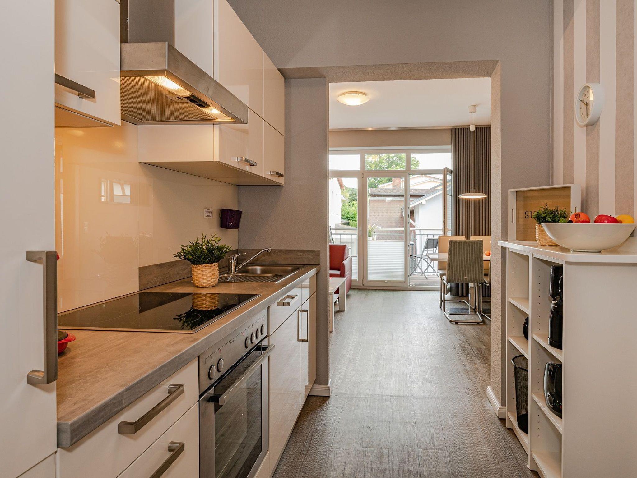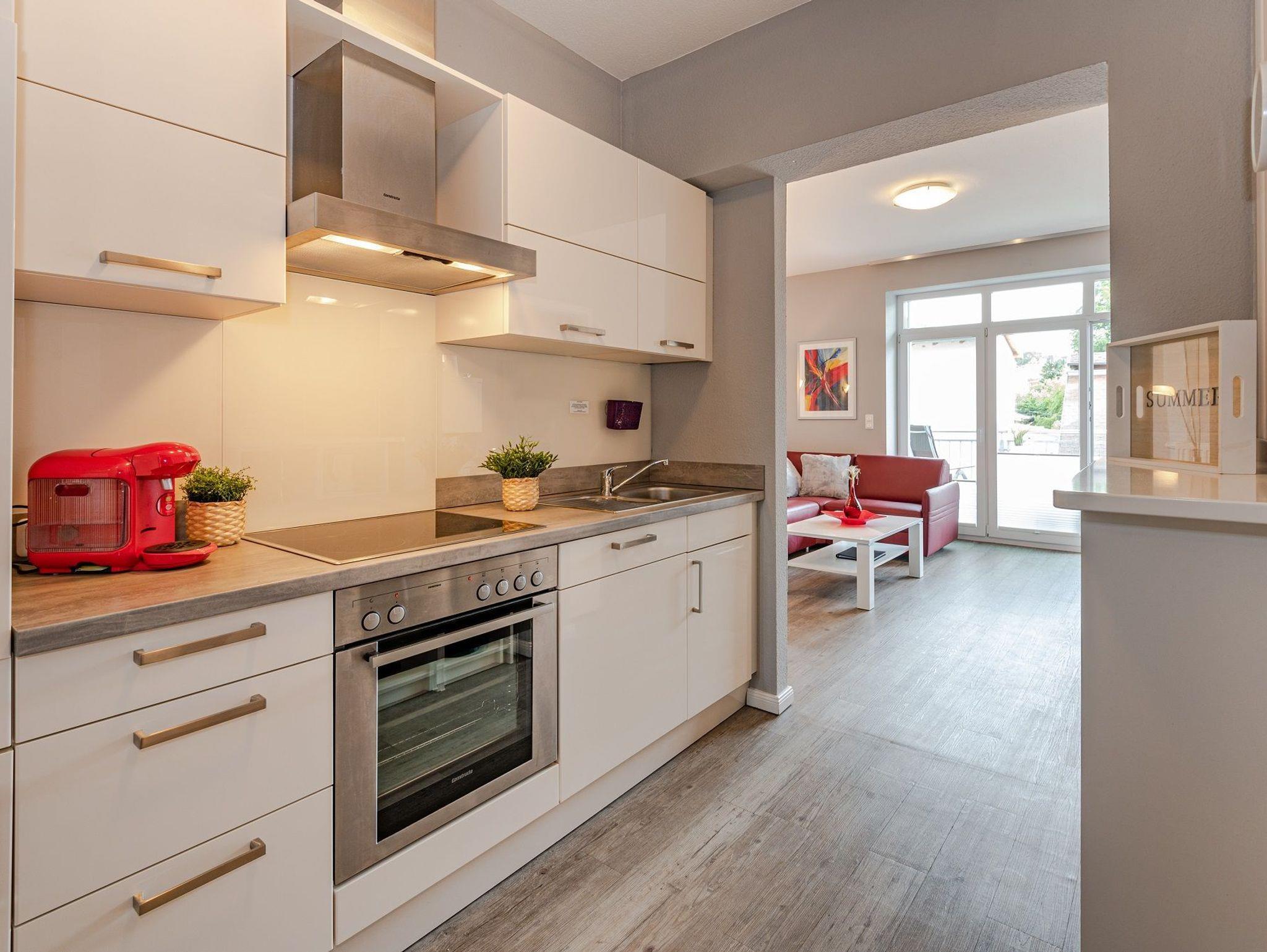 Die hier angrenzende Küchenzeile ist mit einem Kühlschrank mit Gefrierfach, einem Geschirrspüler und einem Backofen mit Cerankochfeld ausgestattet. Eine Kaffeemaschine, ein Toaster und ein Wasserkocher stehen Ihnen hier selbstverständlich zur Verfügung.