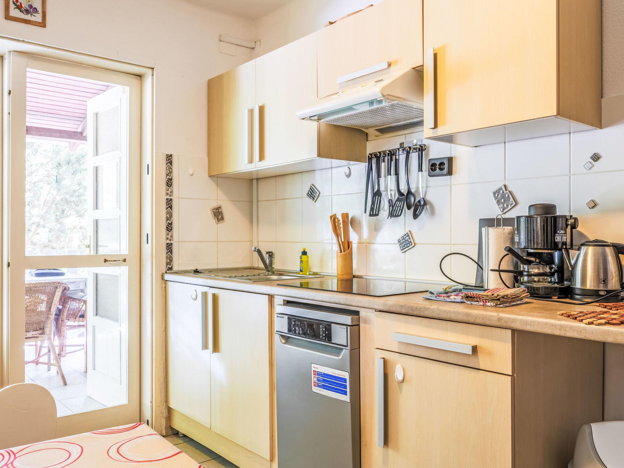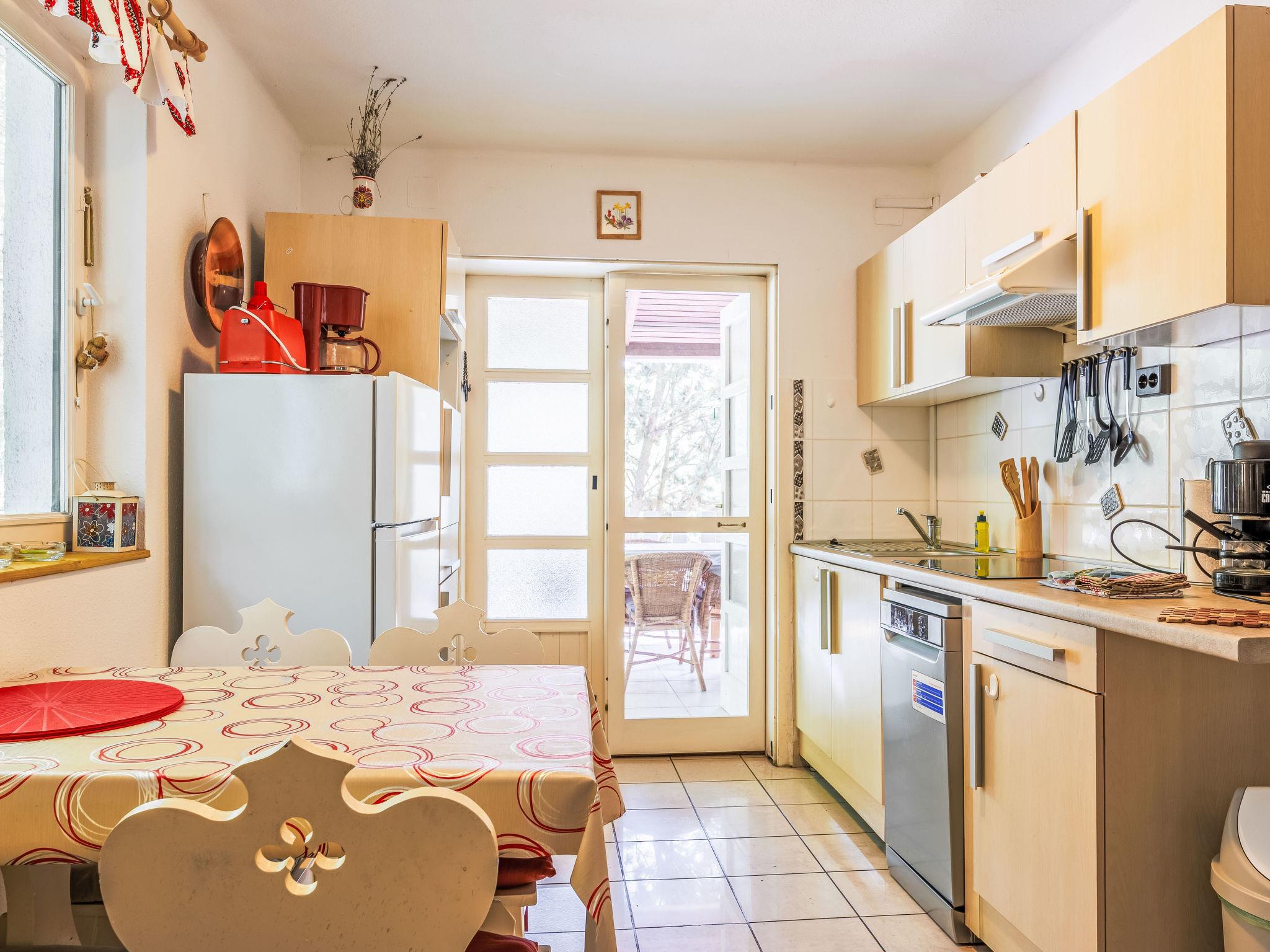 "Violetta", 4-room semi-detached house 80 m2 on 2 levels. Partly renovated in 2022, cosy furnishings: living room with cable TV. Open kitchen (4 hot plates, oven, dishwasher, toaster, kettle, microwave, electric coffee machine). Bath/WC. Heating, air-conditioning (extra). Heating not available in all rooms. Upper floor: entrance hall with 1 bed. 1 room with 2 beds. 1 room with 1 bed, 1 french bed and cable TV. Exit to the balcony. Bath/WC. Terrace roofed. Terrace furniture, deck chairs. Facilities: washing machine. Parking (roofed, fenced). MA20017757