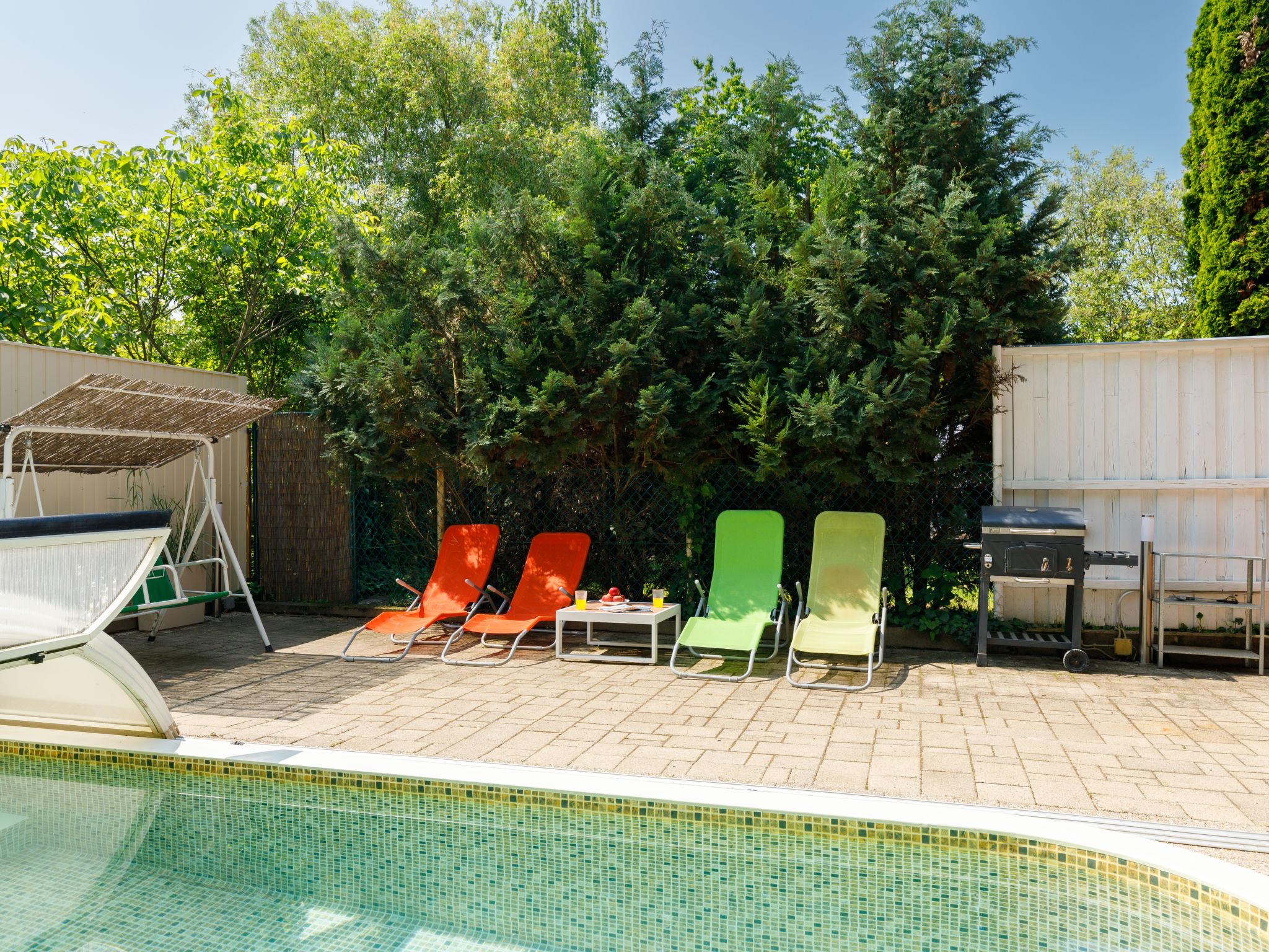 Balatonkenese 22 km from Siófok: The accommodation is a two-under-one-roof where the two parts are connected through the garden. There are two living rooms and two complete kitchen. In one part 6 persons can sleep, the other part offers 5 beds. Cosy semi-detached house, 2 storeys. In the resort, in a quiet position, 1 km from the lake, 700 m from the beach. Private: garden (fenced), swimming pool angular (6 x 3 m, 18 m2, depth 90 cm, seasonal availability: 01.May. - 15.Sep.) with shutter cover. Outdoor shower, garden furniture, barbecue. In the house: WiFi, air conditioning (extra). Grocery 1 km, supermarket 5 km, restaurant 800 m, bakery 1 km, café 1 km, bicycle rental 850 m, bus stop "Balatonkenese, újtelep" 210 m, railway station "Balatonkenese" 1 km, grass beach 730 m, thermal baths "Tamási Thermal Spa" 61 km. Surf school 7 km, sailing school 2 km, tennis 800 m, riding stable 2 km, cycle lane 150 m, children's playground 600 m. Nearby attractions: Siófok Zoo 18 km, Balatoni Bob Theme Park 10 km, Balatonfüred 47 km, The Benedictine Abbey of Tihany 54 km, Tamási Thermal Spa 53 km.