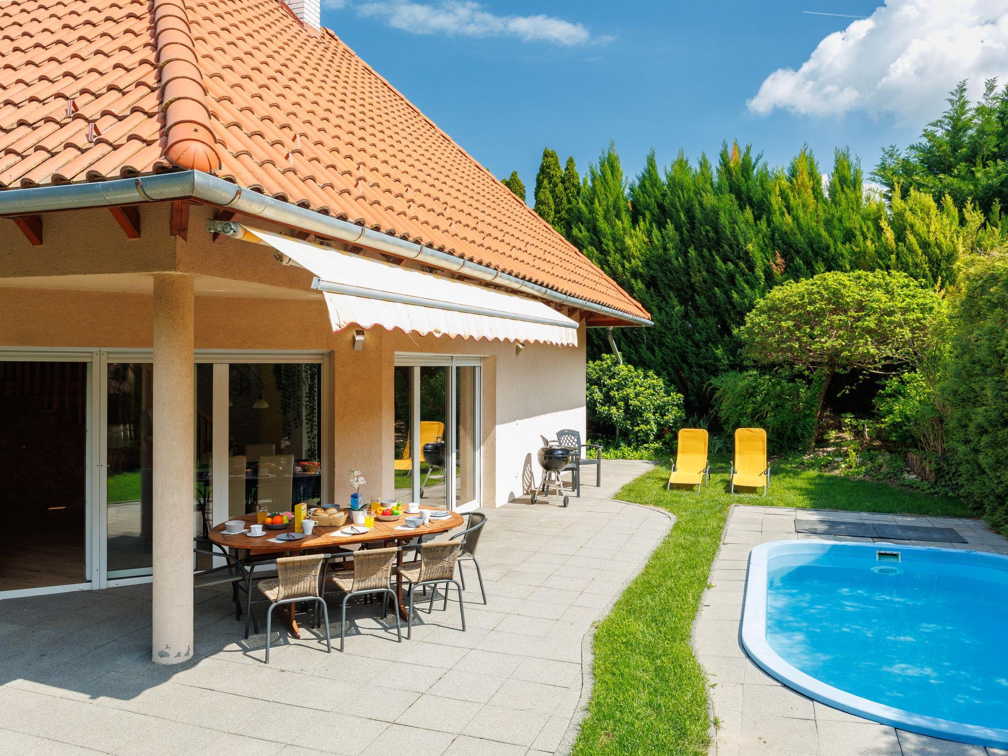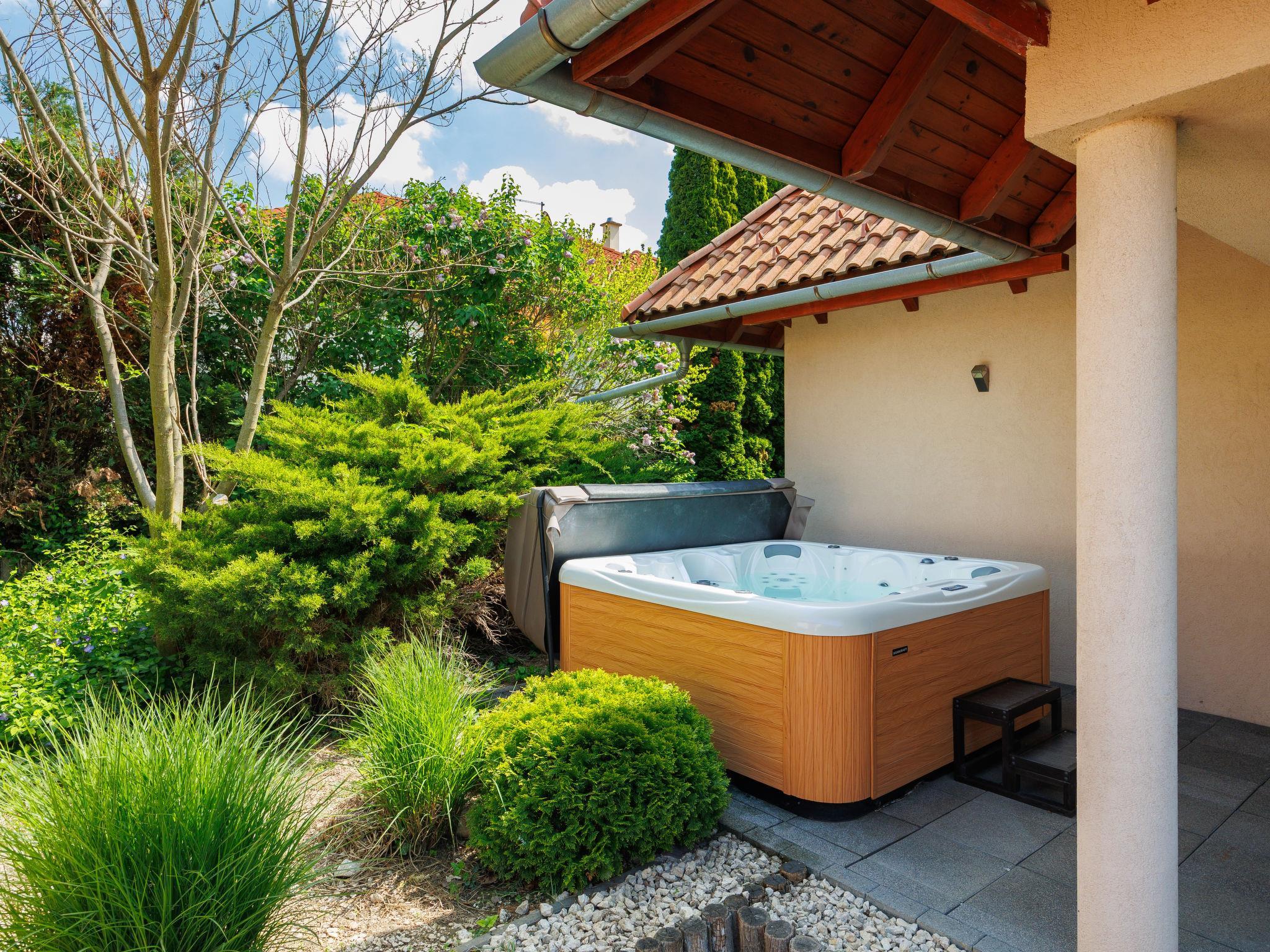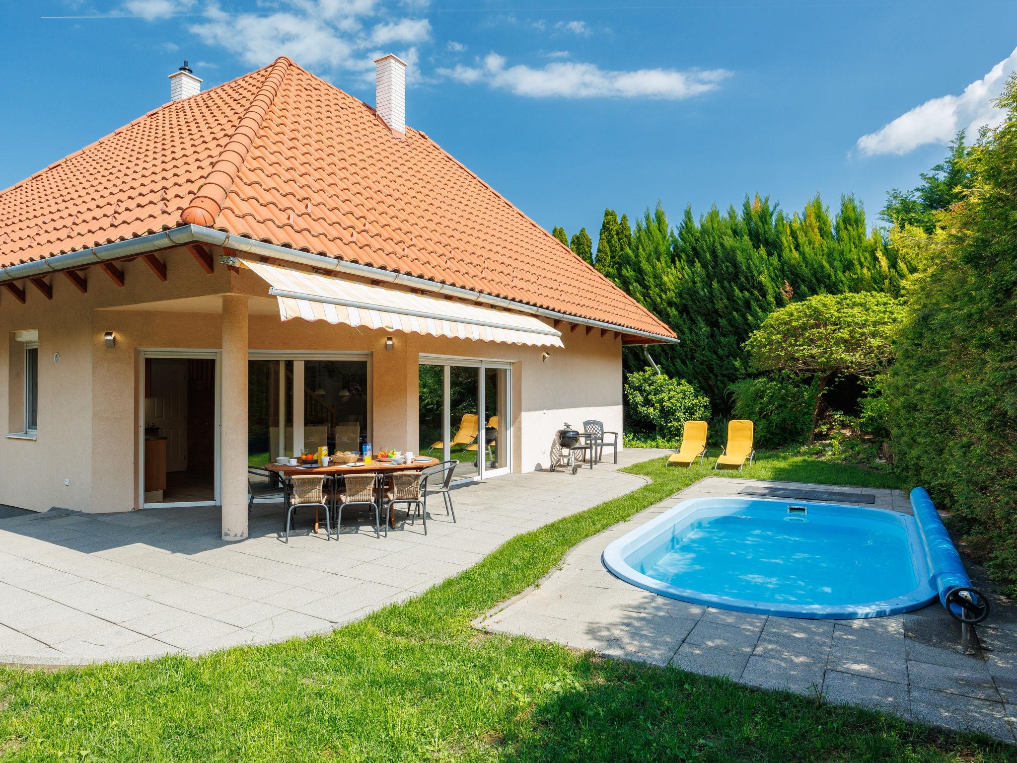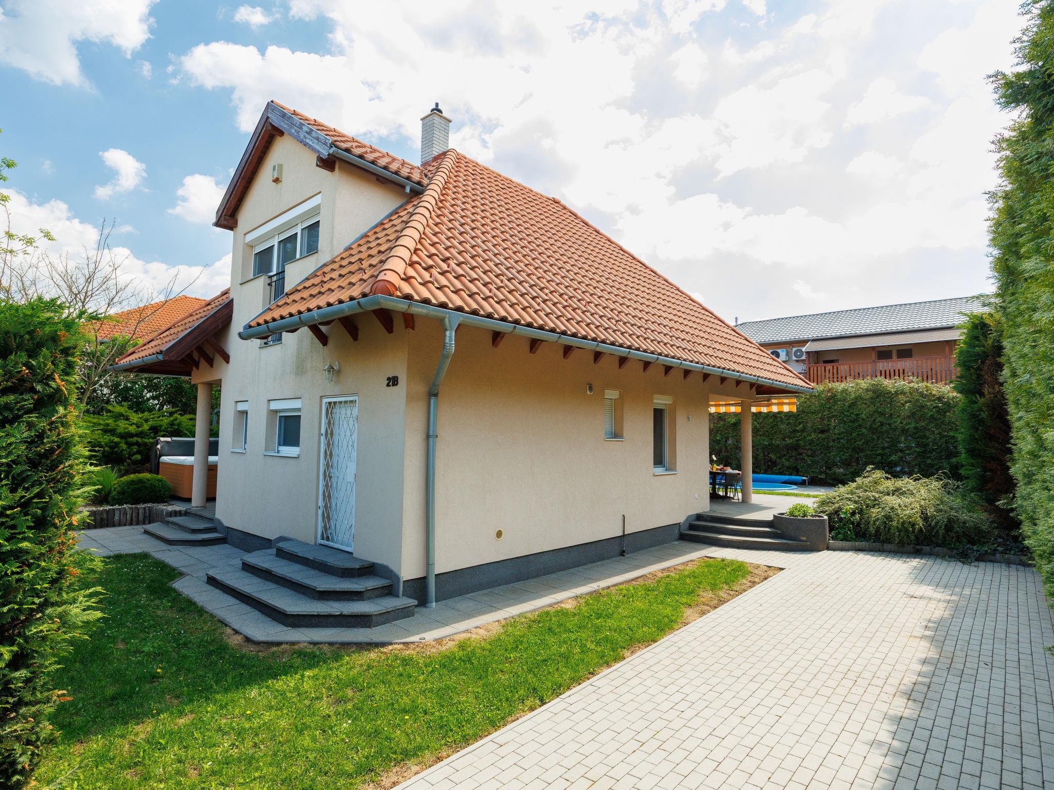 Szabadifürdo 4 km from Siófok: Beautiful, cosy villa "Perla", built in 2007, renovated in 2023. 4 km from the centre of Siofok, on the outskirts, in a quiet, sunny position, 500 m from the lake, 850 m from the beach. Private: property (fenced), beautiful garden, lawn for sunbathing, swimming pool kidney shaped (3 x 4 m, depth 120 cm, seasonal availability: 01.May. - 15.Sep.) with internal staircase. Fireplace. In the house: WiFi, sauna (extra). Hot tub (extra). Central heating system, burglar alarm system. Parking (for 2 cars) on the premises. Shop 1 km, supermarket 3 km, restaurant 1 km, bus stop 1 km, railway station "Siofok-Szabadifurdo" 1 km, grass beach 500 m, thermal baths 1.5 km. Sports harbour 4 km, tennis 1 km, riding stable 10 km, cycle lane 300 m, children's playground 800 m. Nearby attractions: Siófok Giant Wheels 5 km, Aquapark Siófok 2 km, Adventure Park Zamárdi 12 km, Siófok Bella Zoo 1.5 km, Kereki Dinosaurs Park 30 km, Water Tower Siófok 5 km. Please note: railway line closeby.