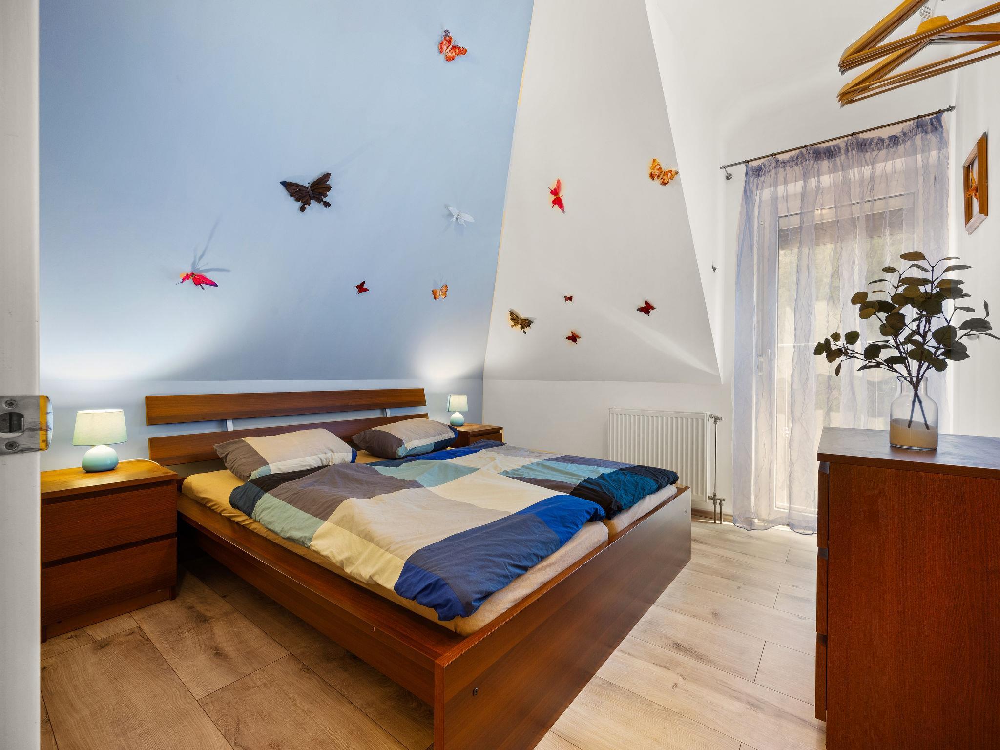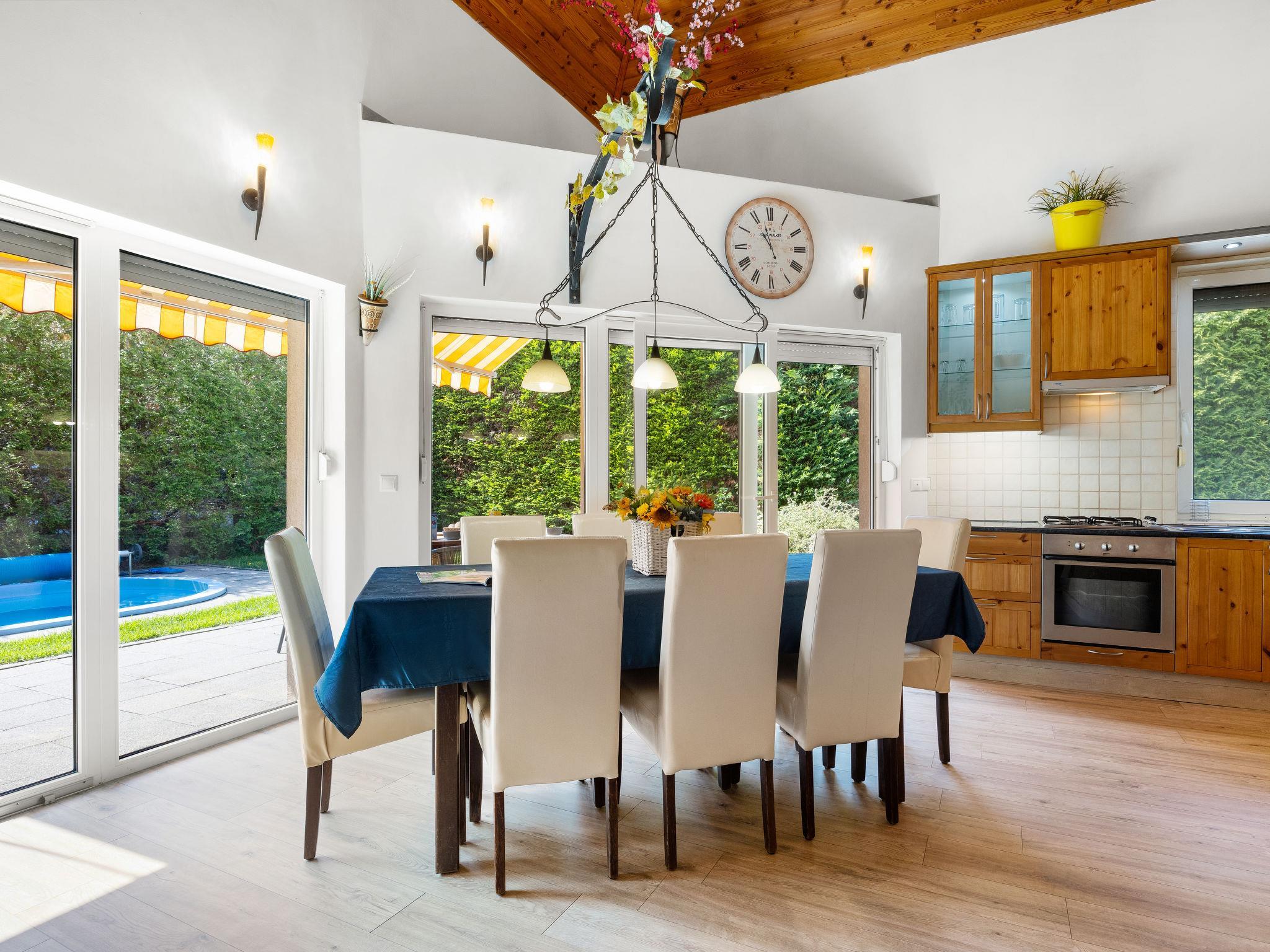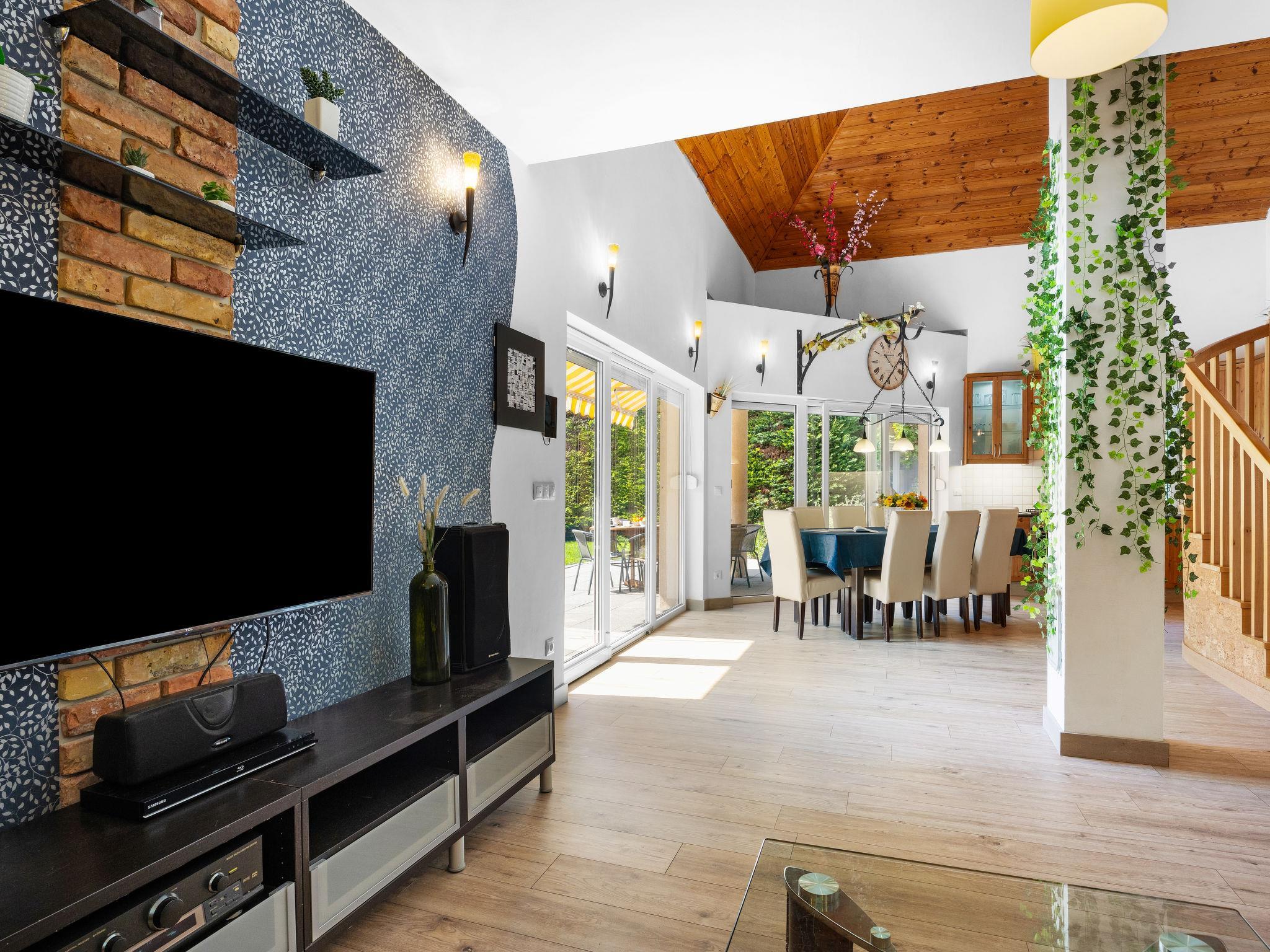 Szabadifürdo 4 km from Siófok: Beautiful, cosy villa "Perla", built in 2007, renovated in 2023. 4 km from the centre of Siofok, on the outskirts, in a quiet, sunny position, 500 m from the lake, 850 m from the beach. Private: property (fenced), beautiful garden, lawn for sunbathing, swimming pool kidney shaped (3 x 4 m, depth 120 cm, seasonal availability: 01.May. - 15.Sep.) with internal staircase. Fireplace. In the house: WiFi, sauna (extra). Hot tub (extra). Central heating system, burglar alarm system. Parking (for 2 cars) on the premises. Shop 1 km, supermarket 3 km, restaurant 1 km, bus stop 1 km, railway station "Siofok-Szabadifurdo" 1 km, grass beach 500 m, thermal baths 1.5 km. Sports harbour 4 km, tennis 1 km, riding stable 10 km, cycle lane 300 m, children's playground 800 m. Nearby attractions: Siófok Giant Wheels 5 km, Aquapark Siófok 2 km, Adventure Park Zamárdi 12 km, Siófok Bella Zoo 1.5 km, Kereki Dinosaurs Park 30 km, Water Tower Siófok 5 km. Please note: railway line closeby.